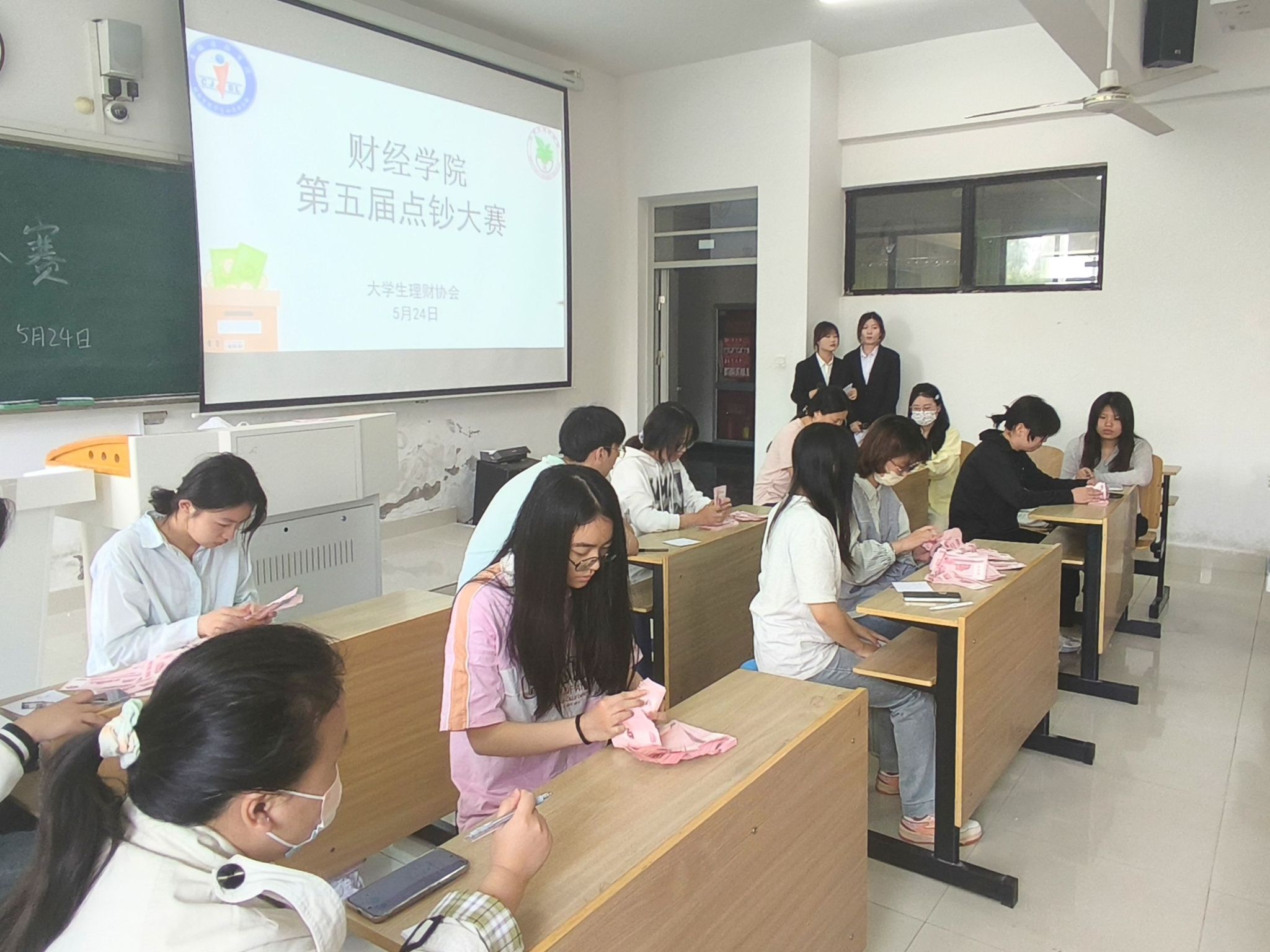 5月24日,财经学院学生会在致知楼C208举办“财经文化节”第五届点钞大赛。来自银行业的五位优秀校友郭梦月、陈焕焕、姚亮、李亚辉、侯梓隆应邀担任评委。