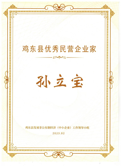 2月22日,在鸡东县发展非公有制经济(中小企业)工作领导小组授牌表彰了完美app官方在线入口“鸡东县就业突出贡献优秀民营企业”“鸡东县投资突出贡献优秀民营企业”“鸡东县产值突出贡献优秀民营企业”“鸡东县社会突出贡献优秀民营企业”、总经理孙立宝获得“鸡东县优秀民营企业家”称号。