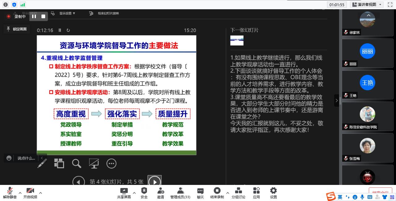 为加强教学质量监控工作,促进教师教学水平提升,保障线上线下教学工作规范开展,4月15日下午,学校召开2022年春季学期期中教学督导工作会议。全体校教学督导员、院级督导组组长及督导考核办公室成员参加了会议,会议由督导考核办公室主任程斌主持。