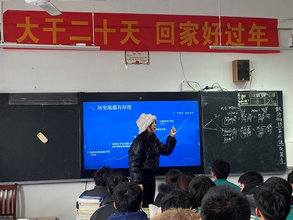 2月4日,动物医学214班刘晗和团队两名成员来到母校涡阳县育萃高级中学,开展主题为“情系母校,助梦安科”的宣讲汇报活动。宣讲前,团队成员联系了高中班主任介绍了学校基本情况,高中老师对我校的办学成就、师资力量、学科建设、综合实力等方面表示高度认可。随后,团队成员走进班级,向学弟学妹介绍我校,以亲身经历分享了自己在高考备考期间的努力和坚持,以及在大学里如何通过不断学习和实践提升自己的综合素质,让更多高中学子了解我校的内涵和魅力。