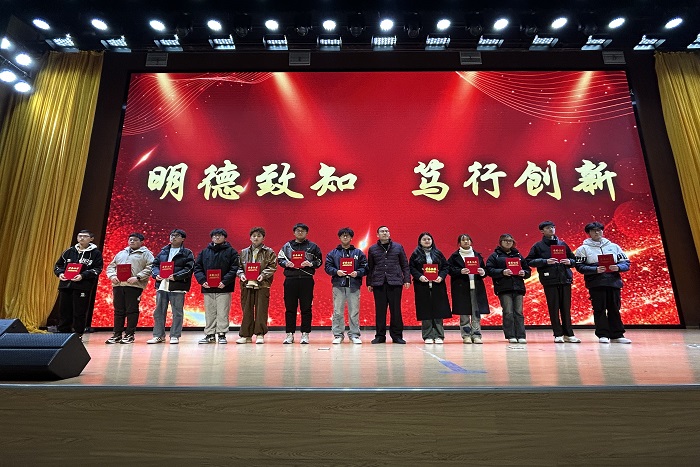 闭幕式晚会由暖场视频拉开序幕,共分为四个篇章。第一篇章《明学笃行》,由主持人宣布第二届“电创未来”文化节科创比赛类、学科竞赛类、艺术赛事类、学党史、体育赛事类、特色导生团、学风建设等活动获奖学生名单,学院领导班子为获奖同学颁奖并合影留念。白广波登台向获奖同学致以热烈祝贺,对学院学生取得的成绩给予了高度赞扬,他鼓励电气与电子工程学院的学生们奋发向前,不负青春年华。