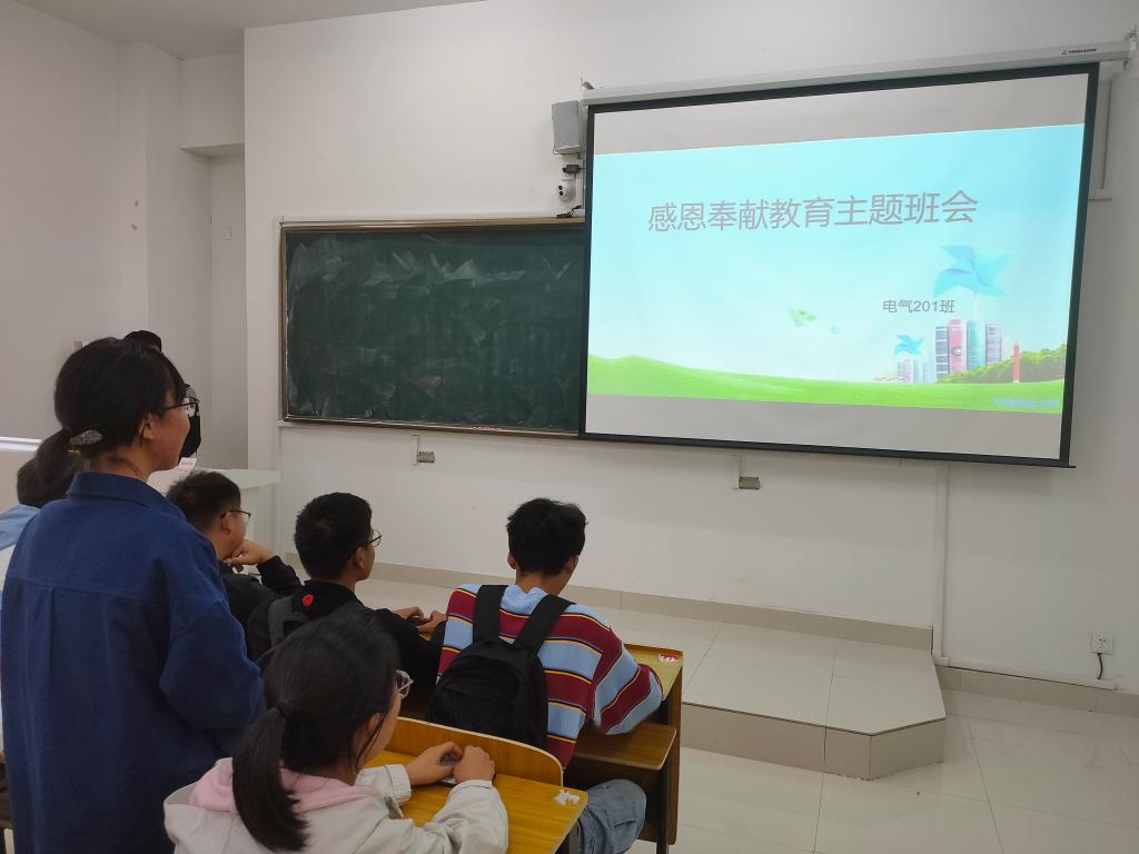 主题班会以班级同学合唱、手语表演《感恩的心》开始。活动中,各班播放感恩教育主题宣传片、微电影等,随后,同学们结合自身经历分享感恩事例。电气201班班长李海洋感慨道:我们应该常怀一颗感恩的心,感恩父母,赐予生命、不求回报的爱;感恩老师,传授知识、讲明事理;感恩朋友在困难时给予帮助。感恩是一种美德,奉献是一种责任。学会感恩,就懂得尊重他人,发现自我价值。
