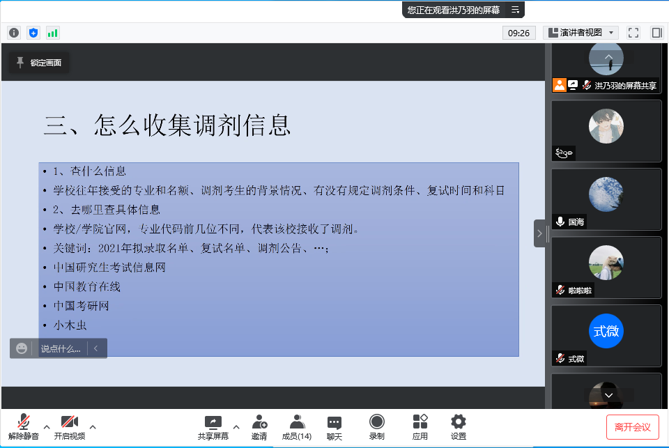 考虑到部分毕业生不在校,学院副院长国海组织开展线上线下同步视频会议,为有面试及调剂需求的学生分析当下研究生面试及调剂的注意事项。国海指出,考研升学是本科生毕业后优质选择之一,学历的提升对我们未来发展有重要的影响。参与考研的同学应做到,一是认真准备复试,做好专业课和英语双线准备;二是积极联系调剂,关注各高校官网发布的调剂信息。会后,国海对线上线下同学关于调剂院校、专业的选择等问题给出了进一步的指导。
