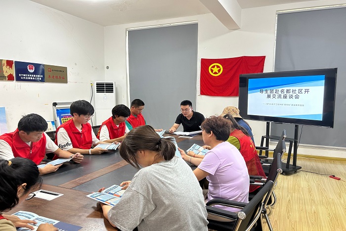 活动过程中,于宏亮和与会导生向社区工作者详细介绍了学院的“双导制”育人机制。他指出,双导制是新时代中国特色社会主义背景下的高等学校探索“一站式”学生服务工作的创新模式,充分发挥高校导师与导生双重育人管理实效性,提供个性化的成长指导和帮助。他认为,大学生暑期社会实践是导生不断提升服务水平、自主学习能力和综合素质的重要途径。随后,导生向与会人员分发招生宣传册。于宏亮强调,当前是学校招生宣传工作的重要时期,此次实践在社区进行宣传目的在于让广大学生和家长熟悉学校、了解专业、准确掌握志愿填报信息等方面精准提供支持和帮助。最后,社区工作人员表示,希望今后大学生积极参与社区活动,持续加深社区与学院之间的交流合作。