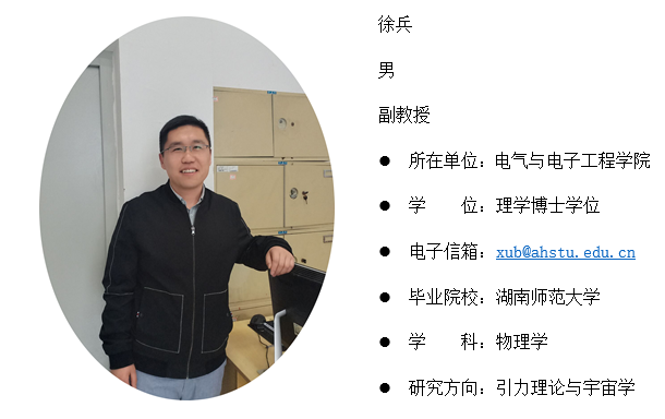 徐兵,副教授,2019年毕业于湖南师范大学,获理学博士学位,现任光电工程系副主任。主要从事引力理论和宇宙学、天文大数据处理和理论分析等方面的科研工作,研究内容包括宇宙加速膨胀的理论和观测研究、宇宙学参数的约束、机器学习处理天文观测数据等,现主持国家自然科学基金青年项目、省教育厅科学研究重点项目和优秀青年教师培育项目(重点)各一项,以第一作者或通讯作者在《Astrophysical Journal》《Physical Review D》和《European Physical Journal C》等国际学术期刊上发表SCI论文13篇。