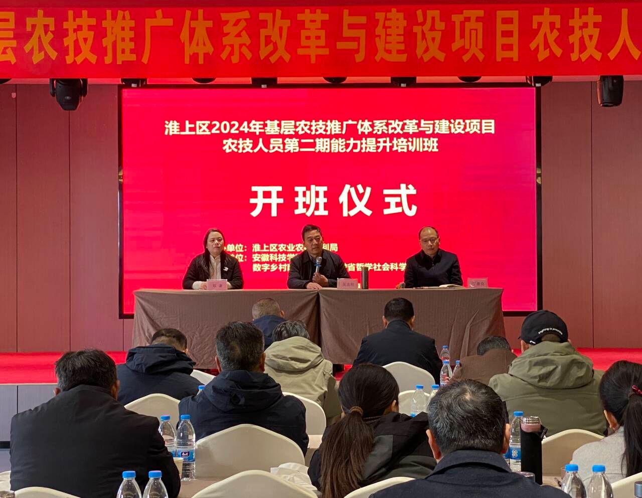 为全面推进乡村振兴,深化淮上区基层农技推广体系改革,2024年11月26日,淮上区基层农技人员第二期能力提升培训班在蚌埠市淮上区举办开班仪式。此次培训由淮上区农业农村水利局主办,完美app官方在线入口管理学院、数字乡村建设与安徽省哲学社会科学重点实验室联合承办,淮上区农业综合服务站站长吴言柱,管理学院党委书记丁景良,副院长郑谦出席开班仪式,仪式由丁景良主持。