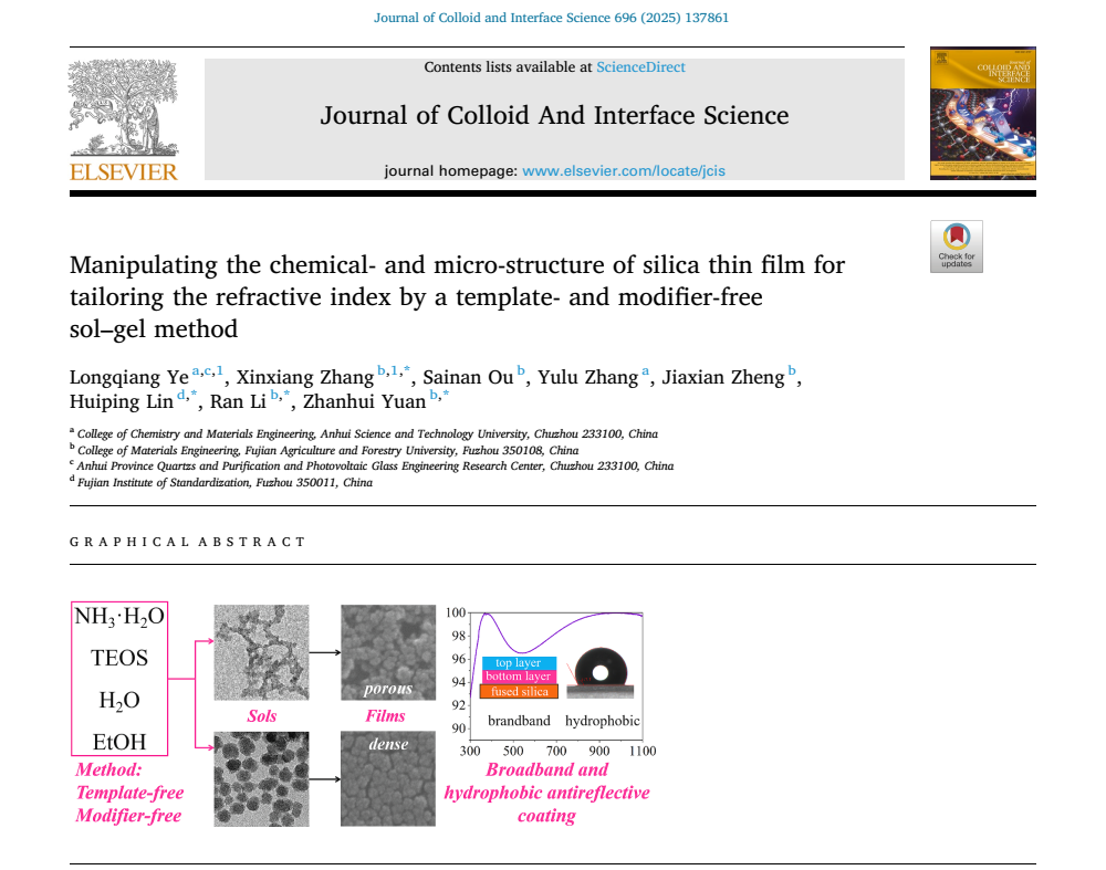 近日,我校化学与材料工程学院硅基新材料团队联合福建农林大学等单位在胶体与界面科学领域顶级期刊《Journal of Colloid and Interface Science》(中科院1区期刊,IF=9.4)发表了题为“Manipulating the chemical- and micro-structure of silica thin film for tailoring the refractive index by a template- and modifier-free sol-gel method”的研究论文。