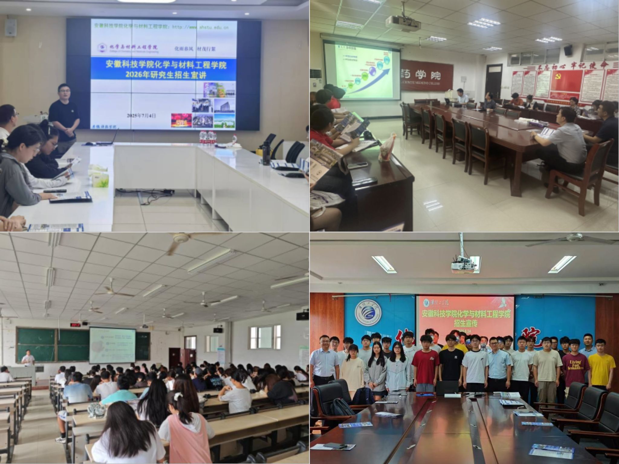 为进一步扩大材料与化工专业学位研究生招生影响力,化学与材料工程学院组建招生宣传小组,于6月底至7月底先后赴亳州学院、阜阳理工学院、淮阴工学院、沧州交通学院、黄山学院等省内外五所高校,开展2026级材料与化工专业学位研究生招生系列宣传工作。