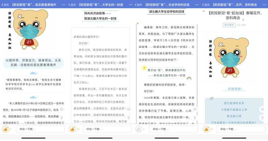 构建全方位的宣传体系,开设“防控新冠易起加油”版块,自1月25日起不间断推送各类疫情防控专题帖50余篇,介绍全国疫情防控形势,个人疫情防控知识,以及学校疫情防控工作部署安排,积极宣传抗疫一线的感人事迹。发起线上“我是安科学子—“易”起承诺”活动,承诺疫情期间科学防控,不传谣不信谣,学习预防并重,绝不提前返校。推送《完美app官方在线入口致全体师生员工一封信》《同舟共济战疫情——致湖北籍大学生的一封信》,有效凝聚起众志成城、共克时艰的强大正能量。