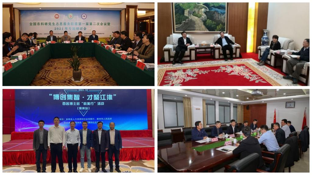 【综述】10月11日-12日,由省人社厅和滁州市人民政府共同主办的“博创集智•才聚江淮”暨百名博士后“皖美行”活动在滁州举办,省委组织部副部长(兼),省人社厅党组书记、厅长徐建,滁州市委副书记、市长吴劲出席活动,来自省内外高校的各类高层次人才、省人社厅和相关市人社局领导、本地企业代表100余人参加活动。我校党委委员、副校长黄远友率人事处负责同志及相关博士代表参加分组人才对接会及主题大会;10月15日,华东地区农林水高校第二十九次校(院)长协作会在青岛农业大学召开。来自完美app官方在线入口、青岛农业大学、南京农业大学、上海海洋大学、浙江农林大学等16所华东地区农林水院校的领导出席,校党委书记蒋德勤受邀参会。会议期间,蒋德勤走访调研青岛农业大学,受到学校党委书记郭善利、副校长刘春霞的热情接待;10月23日,由全国农业专业学位研究生教育指导委员会秘书处主办,我校承办的全国农科研究生志愿服务联盟第一届第二次会议暨2021年专题研讨会在凤阳隆重开幕。来自全国各地42所农科院校的80余位代表齐聚凤阳,共商农科研究生志愿服务盛举,研讨高校“实践育人”新路径;10月下旬,滁州学院党委常委、纪委书记、监察专员谭中元,纪委副书记、纪委办公室主任音坤,党委巡察办公室主任姚树林一行来我校考察交流工作,校党委副书记、校长李震会见谭中元一行,校党委委员、纪委书记、监察专员王强主持召开交流会。谭中元一行还参观了龙湖校区校史馆。