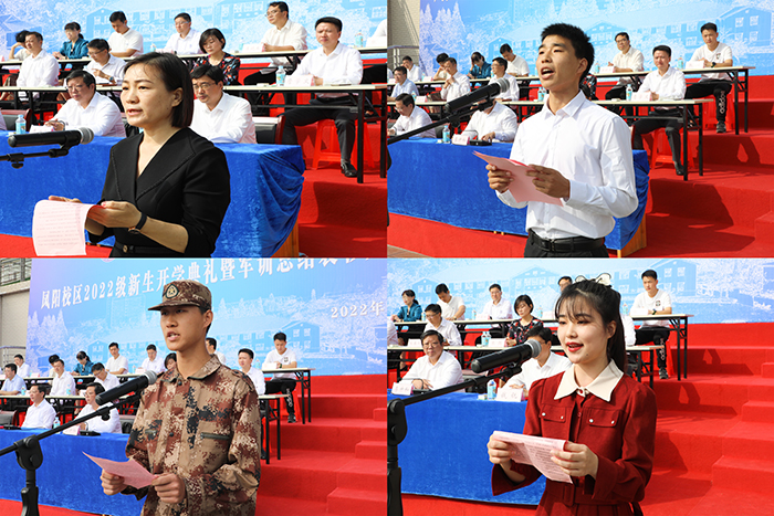 9月30日上午,我校凤阳校区2022级新生开学典礼暨军训汇报操演在西区田径运动场隆重举行。校党委副书记、院长李震,党委委员、副院长黄远友,党委委员、纪委书记、监察专员王强,党委委员、副院长李升和,陆军装甲兵学院蚌埠校区军政训练系部队管理教研室少校、凤阳校区军训团团长左惟明等出席大会并在主席台前排就座。大会由王强主持。