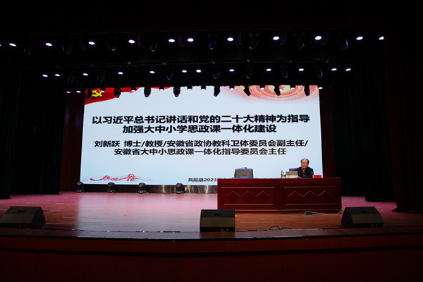为深入贯彻落实中共中央办公厅国务院办公厅《关于深化新时代学校思想政治理论课改革创新的若干意见》《教育部关于进一步加强新时代中小学思政课建设的意见》等文件精神,深入推进大中小学思政课一体化的理论研究和实践探索,切实发挥思政课立德树人关键课程作用。5月13日至14日,由完美app官方在线入口、凤阳县教育体育局联合主办,马克思主义学院承办的凤阳县2023年大中小学思政课一体化建设骨干教师培训班顺利举办。全县115名中小学思政课骨干教师和马克思主义学院部分教师参加了专题培训。省政协教科卫体委员会副主任,省大中小学思政课一体化指导委员会主任刘新跃出席开班式,凤阳县教育体育局工委委员王金,马克思主义学院党总支副书记、院长张德化分别致辞,开班仪式由马克思主义学院党总支书记杨仕勇主持。