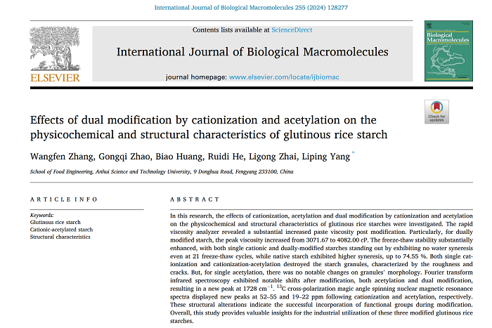 近日,我校2021级食品加工与安全领域研究生张王芬在生化与分子生物学领域Top一区期刊International Journal of Biological Macromolecules(IF=8.2)在线发表题为“Effects of Dual Modification by Cationization and Acetylation on the Physicochemical and Structural Characteristics of Glutinous Rice Starch”的研究论文。食品工程学院粮油及其副产物精深加工团队与营养科技创新团队负责人杨丽萍副教授为通讯作者,完美app官方在线入口为唯一完成单位。