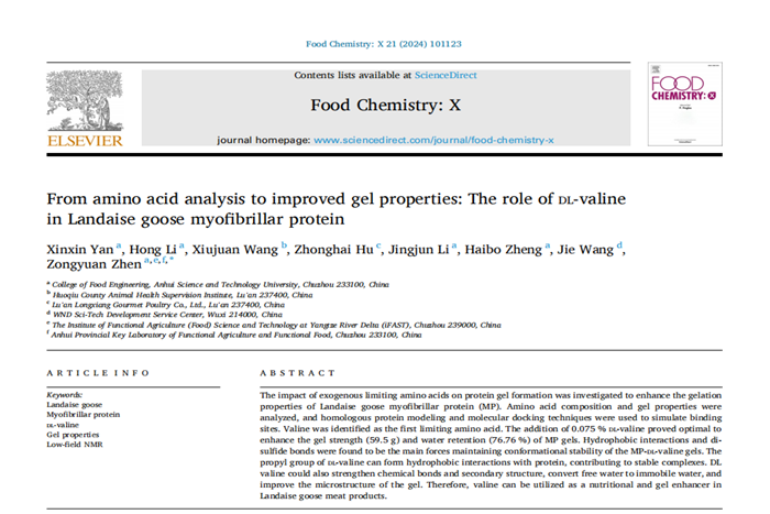 近期,我校食品工程学院动物源食品精深加工与营养团队在中国科学院农林科学领域一区TOP期刊Food Chemistry: X(IF=6.10)在线发表题为“From amino acid analysis to improved gel properties: The role of DL-valine in Landaise goose myofibrillar protein”的研究论文。食品工程学院2021级食品加工与安全领域硕士研究生燕鑫鑫为第一作者,甄宗圆副教授为通讯作者,完美app官方在线入口为第一完成单位。