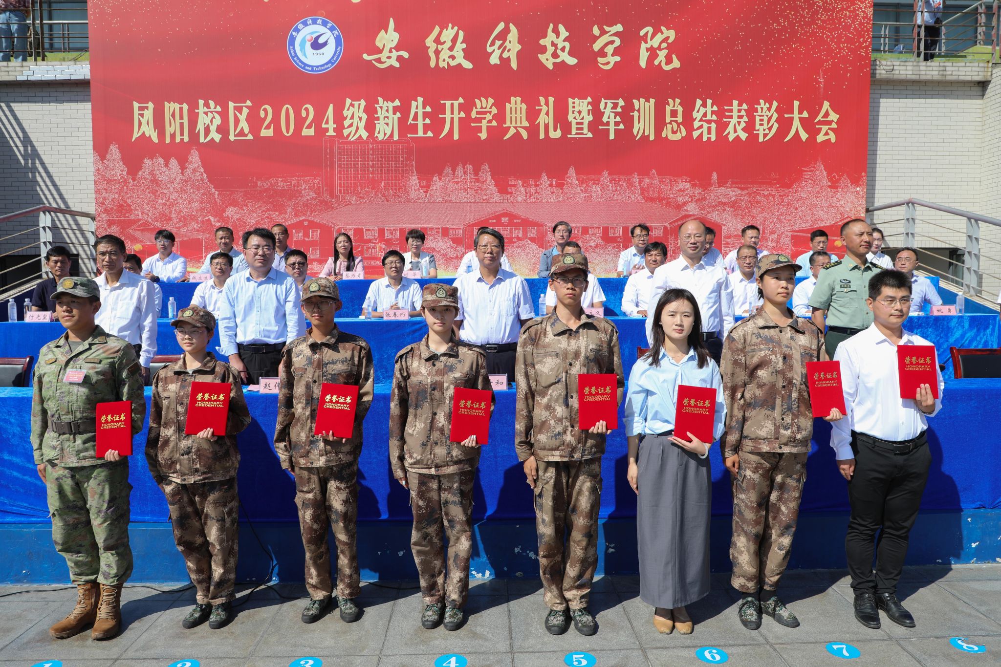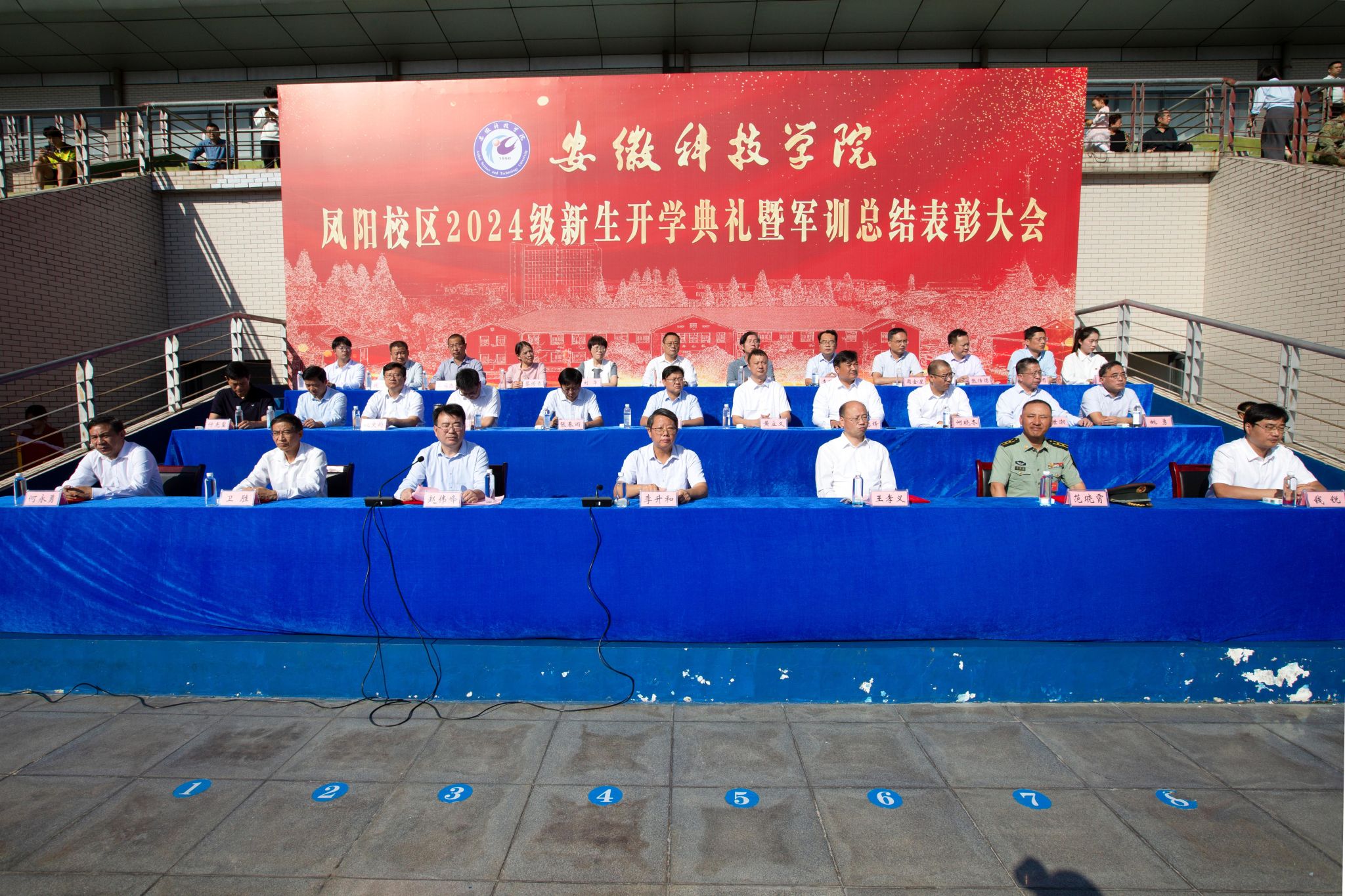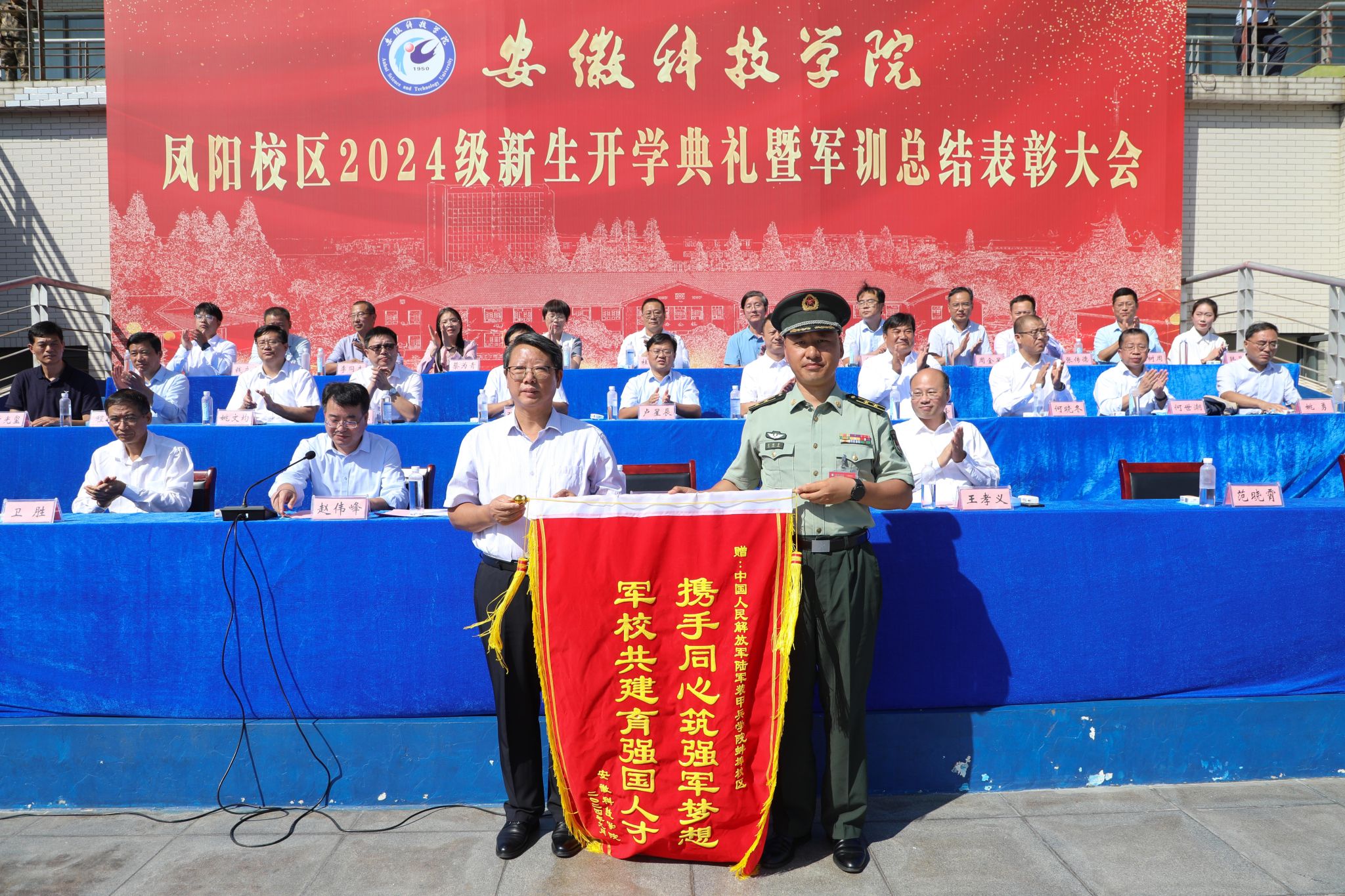 9月28日上午,我校凤阳校区2024级新生开学典礼暨军训总结表彰大会在西区田径运动场举行,校党委委员、副院长李升和,党委委员、副院长王孝义,党委委员、副院长赵伟峰,陆军装甲兵学院蚌埠校区中校、凤阳校区军训团团长范晓霄出席大会并在主席台就座。大会由赵伟峰主持。