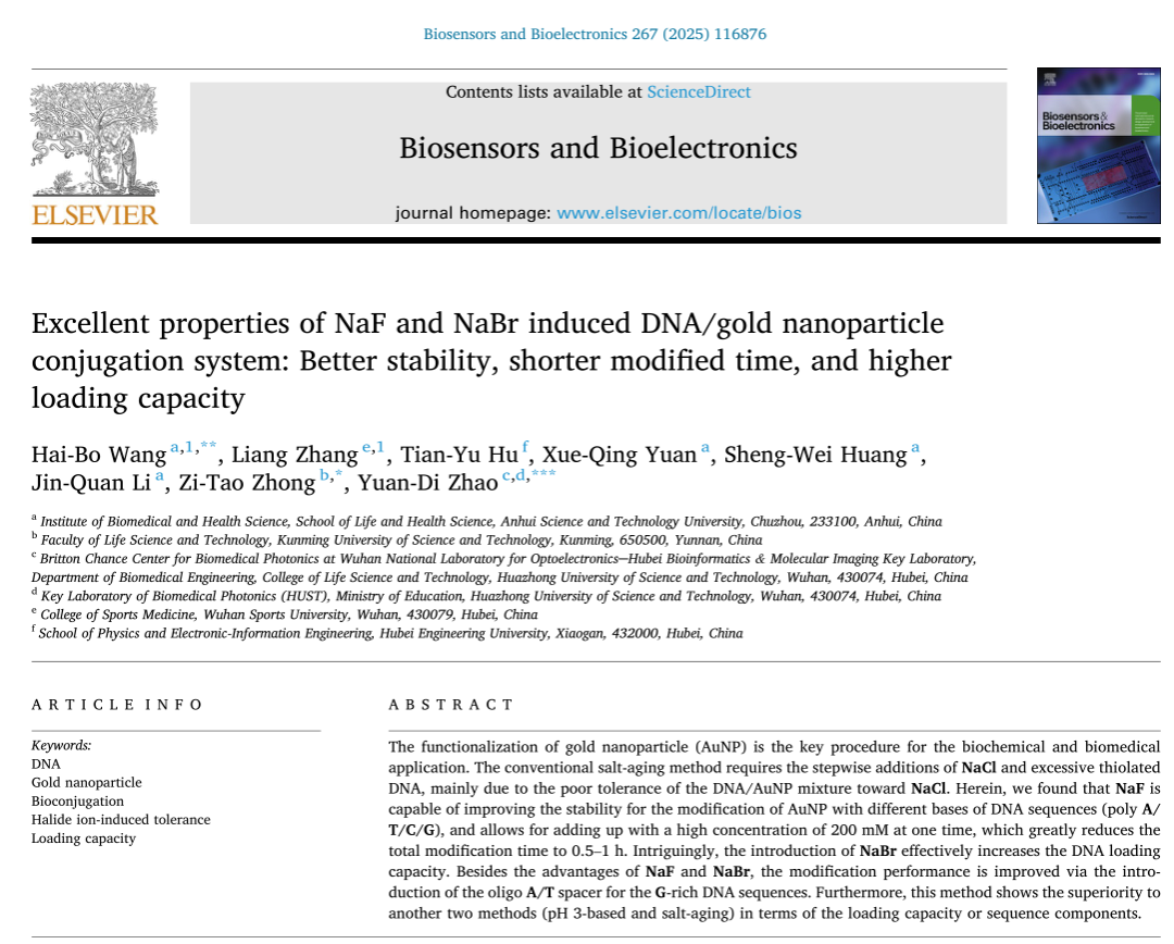 近日,我校生命与健康科学学院王海波博士(第一/通讯作者)在生物传感领域国际顶级期刊《Biosensors & Bioelectronics》(中国科学院一区Top期刊,影响因子:10.7,CiteScore:20.80)在线发表了题为“Excellent properties of NaF and NaBr induced DNA/gold nanoparticle conjugation system: Better stability, shorter modified time, and higher loading capacity”的研究成果,DOI: 10.1016/j.bios.2024.116876。该论文第一单位为完美app官方在线入口,昆明理工大学钟子涛博士和华中科技大学赵元弟教授为共同通讯作者。本研究在安徽省教育厅重点项目(2023AH051869)、完美app官方在线入口引进人才项目(200181)以及安徽雪郎生物科技股份有限公司的经费资助下完成。