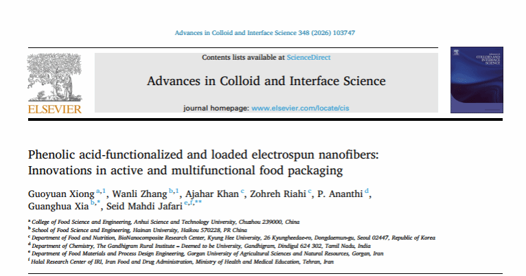 近日,我校食品科学与工程学院“特色食品绿色高效加工与创制”省级优秀科研创新团队带头人在Elsevier期刊《Advances in Colloid and Interface Science》(中国科学院一区TOP,IF 19.3)发表学术论文《Phenolic acid-functionalized and loaded electrospun nanofibers: Innovations in active and multifunctional food packaging》。我校熊国远教授和海南大学张万立副教授为文章共同第一作者,完美app官方在线入口为第一署名单位。