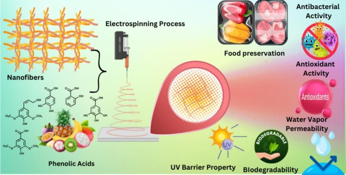 日益增长的可持续食品包装需求,推动了生物活性酚酸结合的电纺丝纳米纤维的创新。该论文重点阐述了酚酸——如单宁酸、没食子酸和茶多酚等在提升电纺纳米纤维生物降解聚合物功能性的关键作用。这些化合物通过氢键与共价相互作用,增强了材料的机械强度、热稳定性和阻隔性能,同时其抗氧化与抗菌活性能够有效抑制食品氧化变质和微生物污染,文献研究证实了其在易腐食品(包括肉类、水果和海鲜)中延长货架期的有效性。此外,通过同轴或多层结构等先进电纺技术实现的控制释放机制,确保了生物活性的持续发挥。该综述也探讨了优化释放动力学与规模化生产所面临的挑战。酚酸功能化纳米纤维将材料创新与实际食品保鲜需求相结合,为食品新一代活性包装设计提供了一种多功能且环境友好的解决方案。该论文得到了安徽省高校优秀科研创新团队(2024AH010007)和完美app官方在线入口科技创新团队项目(2023KJCXTD003)的资助。