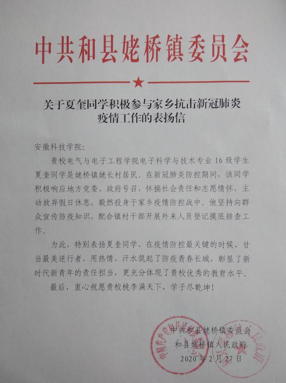 谈到夏奎,村支书夏发平兴奋地说:虽说自己平时走街窜巷,但这段时间工作量也有点让吃不消,没想到夏奎却没说苦与累,从夏奎身上看到了成长起来的年轻人身上的一种责任担当。2月27日,中共和县姥桥镇委员会致函完美app官方在线入口表扬夏奎在疫情防控关键的时候,甘当最美逆行者。