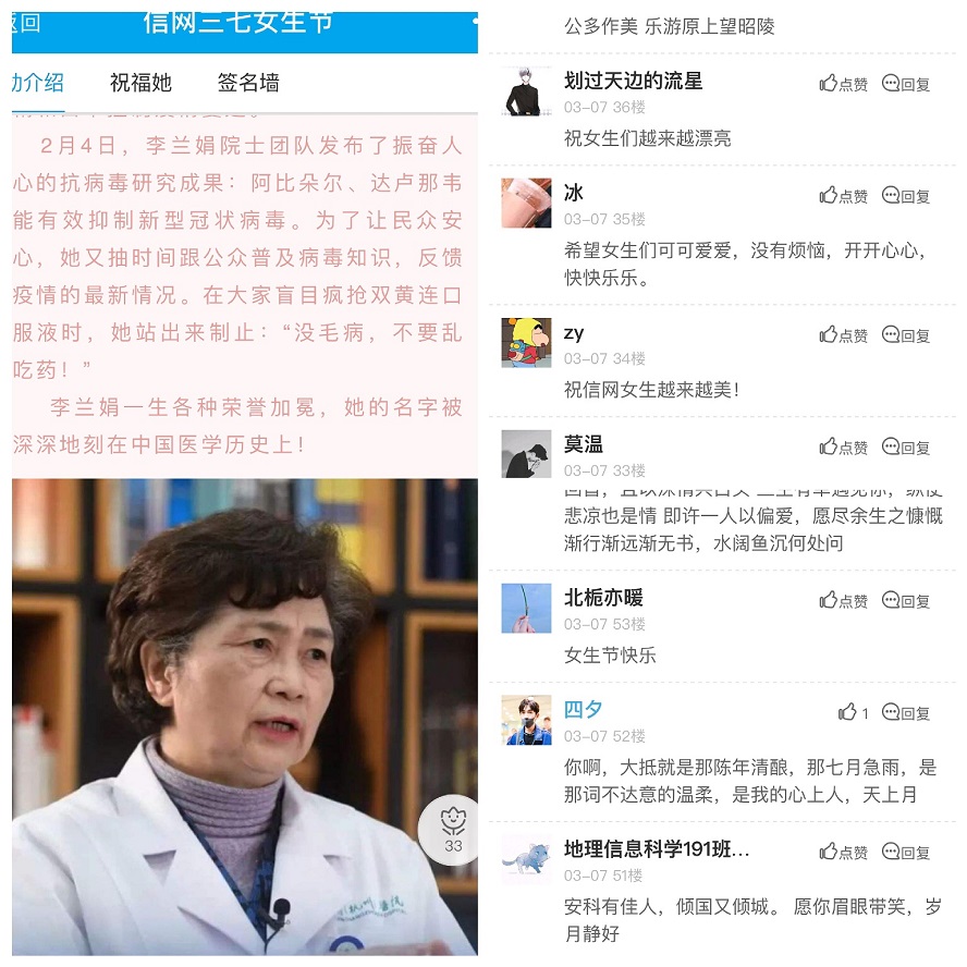 疫情期间,许许多多人奋战在疫情防控一线,这些人中不乏女性的身影,她们奉献自我,用自己的能量点亮一片片星空,温暖人心。期间,信网学子也踊跃担当起家乡战“疫”的志愿者,积极参加志愿者服务工作。用汗水和努力守护家园。她们的身影出现在街头、村口的执勤点,对进出人员进行体温测量、安全排查、信息登记、行程劝返、宣传疫情防控知识等,她们用细心、爱心、信心为最终打赢疫情防控战贡献自己的一份力量。她们只是众多巾帼英雄的缩影,在疫情一线,有更多的“她”在奋斗,学院组织学生在易班平台线上为她们致敬,“云”上为她们祝福!