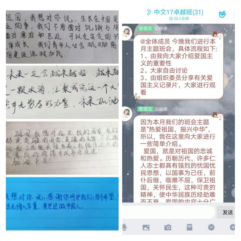 活动期间,各班级以线上班会形式,带领学生观看爱国视频、分享爱国文章,积极讨论爱国的意义和重要性。5月18日法学191班通过网络观看《这就是中国》节目,让同学们深入了解爱国主义精神的内涵和意义,认识什么是爱国主义,正视自己心中的爱国热情和自身的责任担当。5月22日汉语言文学192班团支书刘啸在班会上对“爱国的意义是什么”“爱国的重要性是什么”“如何为国家贡献自己的力量”等问题进行回答。他说,爱国主义是中华民族的民族心、民族魂,是中华民族最重要的精神财富,是中国人民和中华民族维护民族独立和民族尊严的强大精神动力,也是每个中国人都必须牢记在心里的大事。法学182班团支书崔凌轩更是从汉代荀悦《汉纪.惠帝纪》中的一句“封建诸侯各世其位,欲使亲民如子、爱国如家”中,体会出国家是物质利益的寄托、是精神的寄托、是小家的寄托,更是个人的寄托的道理,与同学们分享,鼓励其爱国如爱家。
