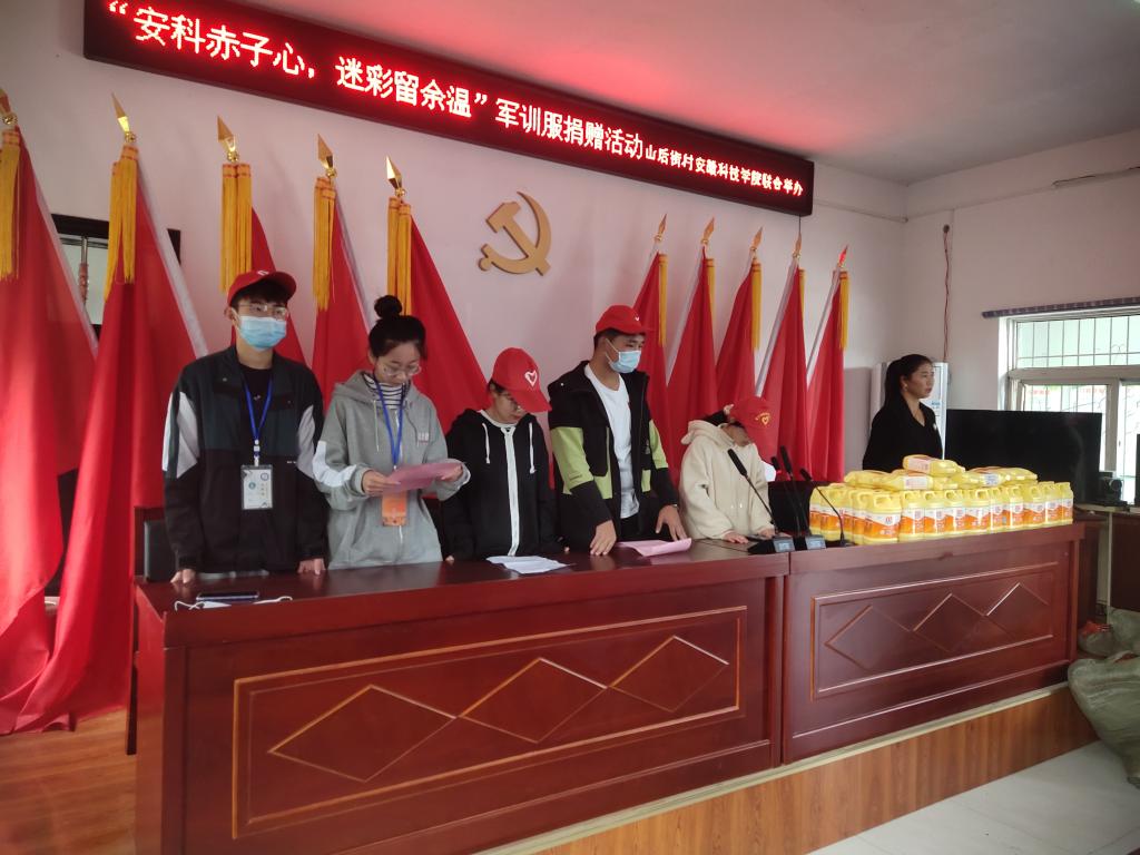 本次军训服捐赠活动通过与山后街村党支部书记左培春商讨之后围绕“奉献爱心,圆梦小康”的主题全面展开,经过前期活动策划、新生军训期间宣传动员以及后期线下组织募捐,共获募捐军训服装190余件,募捐的衣物将赠送到山后街村贫困户和边缘易致贫户的手中。