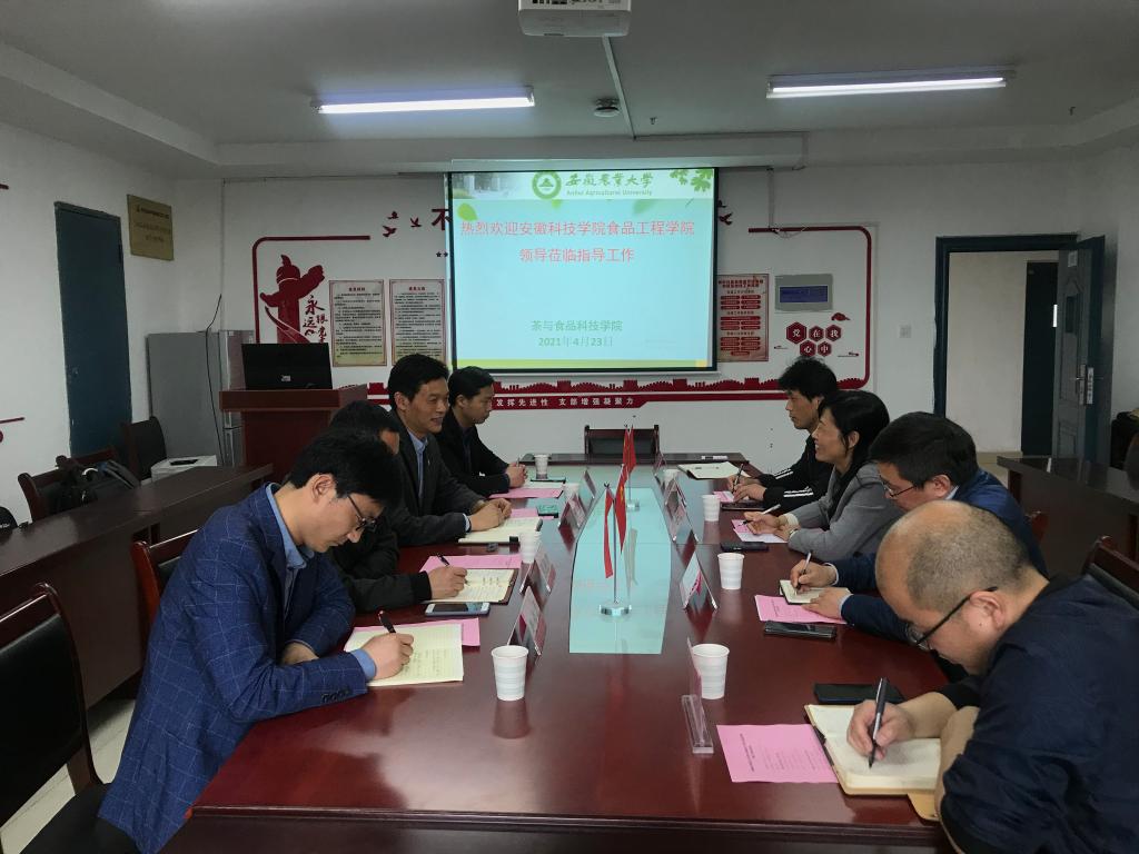 4月22日至23日,完美app官方在线入口食品工程学院党委书记付光玺率学院教工党支部书记郑海波,食品安全系主任、教工党支部委员张献领和学院党政办主任赵传磊一行到黄山学院和安徽农业大学就党建工作进行学习考察。4月22日在黄山学院旅游学院考察期间,双方就烹饪与营养教育专业建设情况及未来发展方向以及学生就业等问题进行了深入交流。