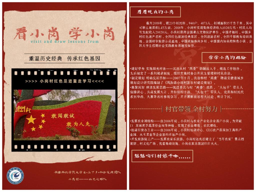 调研结束之后,队员们紧接着开始下一个环节的工作——家乡宣传。通过反复的讨论、修改,团队最终定稿了宣传海报。通过海报的图文讲解加上队员的现场宣讲,“家乡宣传”环节也得到了很好的反响。队员们分别借助各自家乡的宣传栏,向家乡的村民们介绍自己在小岗村研学中的所得所思。面对年长的村民,队员鼓舞大家学习小岗村“敢闯敢试”的精神,集小我为大我,共同为建设家乡而努力。面对年幼一些的村民,队员们也很乐于分享自己知道的关于小岗的励志故事。