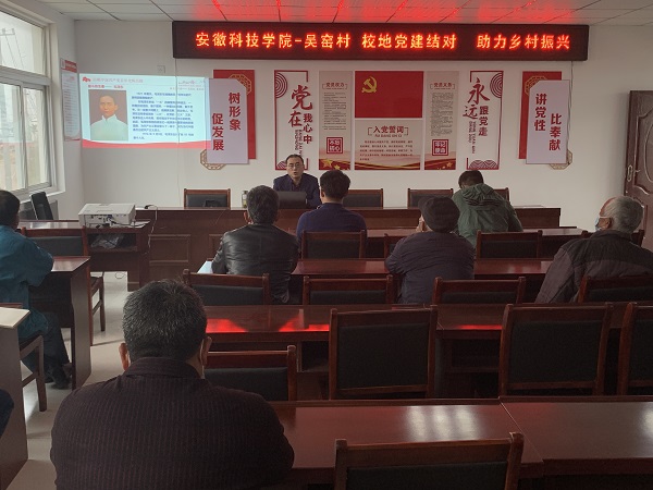 为落实动物科学学院和吴窑村签订的校地党组织结对共建帮扶框架协议内容,3月16日下午,动物科学学院赴凤阳县黄湾乡吴窑村开展讲党课和物品捐赠帮扶活动。动物科学学院党委书记姚勇,动物医学系教工党支部书记、系主任李文超,党政办公室主任、团委书记李焱参加活动,吴窑村党总支第一书记龚争及村干部共同出席了本次活动。