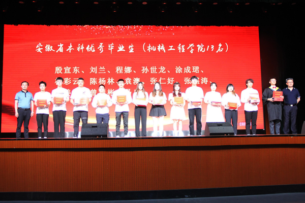 在毕业典礼暨欢送晚会现场,张程宣读了安徽省教育厅、人力资源和社会保障厅、共青团安徽省委联合下发的关于表彰高校2022届优秀毕业生的决定,其中:机械工程学院共有13名学子获评为2022年“安徽省本科优秀毕业生”,陈丰、张严政为13位优秀学子颁发了荣誉证书和纪念品,同时对荣获“完美app官方在线入口优秀毕业生”的45名机械学子进行了表彰。