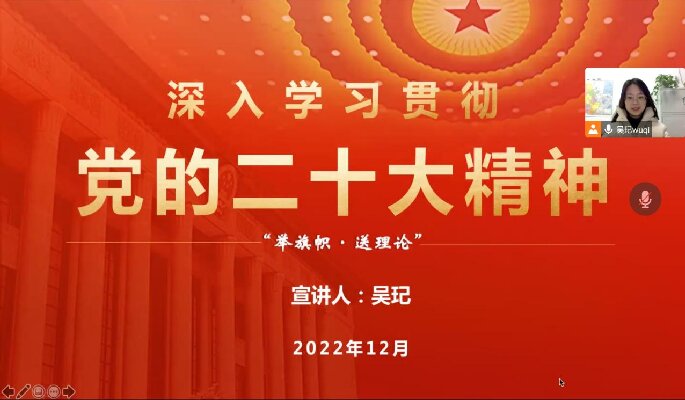 奋楫扬帆新征程,勇毅笃行谱新篇。为深入学习宣传贯彻党的二十大精神,引领广大青年学生成为能够担当民族复兴大任的时代新人,12月20日下午,食品科学与工程专业学生党支部线上开展了深入学习贯彻党的二十大精神理论宣讲,校辅导员理论宣讲团成员、食品科学与工程专业学生党支部书记吴玘主讲,支部全体党员及部分积极分子参与。