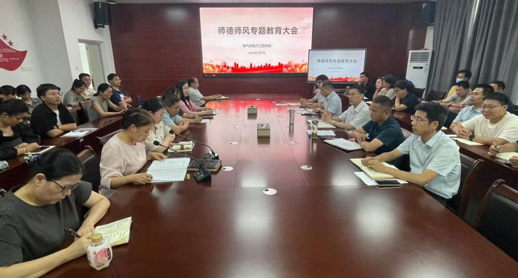 为扎实推进学院师德师风建设工作,7月7日下午,电气与电子工程学院在尚行楼A301会议室召开师德师风专题教育大会。学院党政领导及全体教职工参加会议,会议由学院党委副书记、纪委书记尚磊主持。