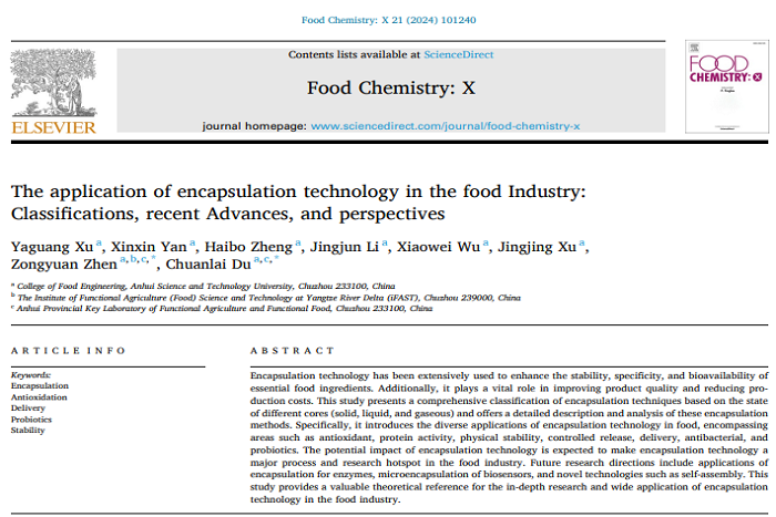 近期,我校食品工程学院动物源食品精深加工与营养团队在中国科学院农林科学领域一区期刊Food Chemistry: X(IF=6.10)在线发表题为“The Application of Encapsulation Technology in the Food Industry: Classifications, Recent Advances, and Perspectives ”的综述论文。食品工程学院2021级食品加工与安全领域硕士研究生徐亚光为第一作者,杜传来教授和甄宗圆副教授为通讯作者,完美app官方在线入口为第一完成单位。