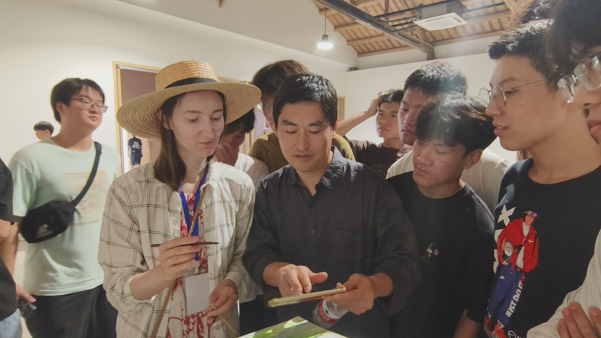 在西递黟山大学堂教室内,建筑学院的师生们与国际艺术家们展开了热烈而深入的交流与探讨。他们围绕作品的创作理念、技法运用以及艺术表现等方面展开了深入地讨论,共同分享彼此的艺术见解和创作心得。这种跨界的交流与合作,不仅为师生们提供了宝贵的学习机会,也进一步拓宽了他们的艺术视野和创作思路。
