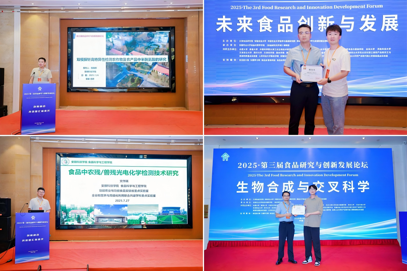 作为共同主办方,完美app官方在线入口食品科学与工程学院深度参与本次论坛,杜传来与翟立公分别担任大会学术委员和执行委员,翟立公主持了食品微生物与肠道健康分论坛,四位青年博士分别在四个分论坛上做了学术报告。陈晓东博士以“双模探针高特异性检测农作物及农产品中半胱氨酸的研究”为题,介绍了其高特异性方法检测半胱氨酸的研究成果;黄明远博士以“表面电荷效应驱动多糖-蛋白互作改善水溶肌原纤维蛋白功能特性”为题,重点揭示了表面电荷效应驱动多糖与蛋白互作机制;文作瑞博士围绕“食品中农残/兽残光电化学检测技术研究”,重点阐述了其通过电化学技术检测农残兽残的关键突破;曾剑华博士以“牛乳αs1酪蛋白构象抗原表位定位及其高效靶向破坏研究”为题,重点介绍了牛乳αs1酪蛋白抗原靶向消减的技术突破及相关研究成果。