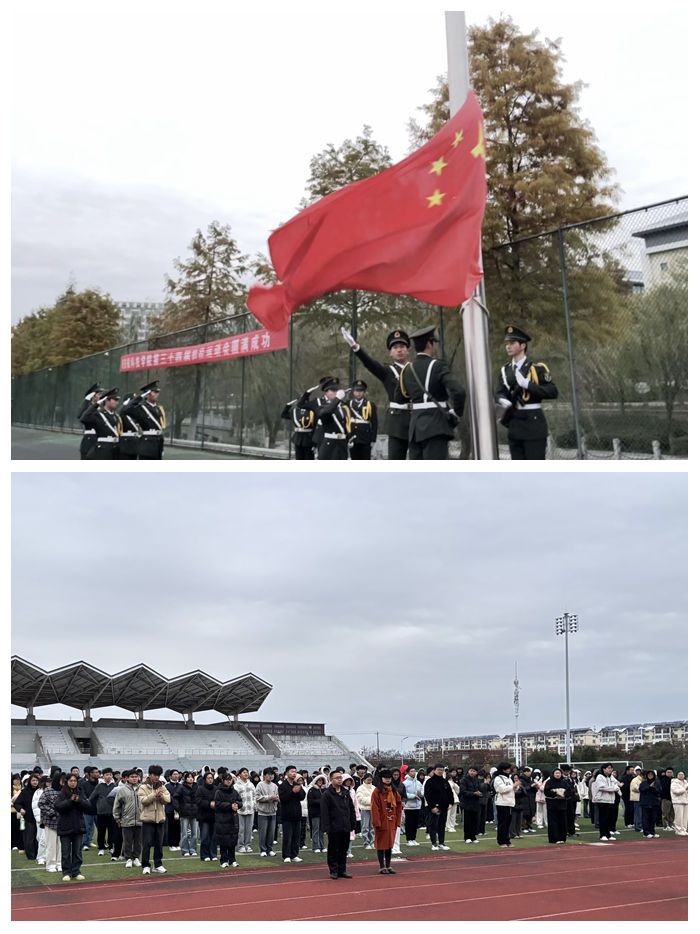 6时35分,伴随着铿锵有力的正步声,国旗护卫队队员身姿挺拔、步伐坚定,护送鲜艳的五星红旗走向升旗台。在雄壮激昂的《义勇军进行曲》中,国旗冉冉升起。全体师生肃立注目,齐声高唱国歌,嘹亮的歌声划破晨空,点燃了冬日清晨最炽热的爱国热情。