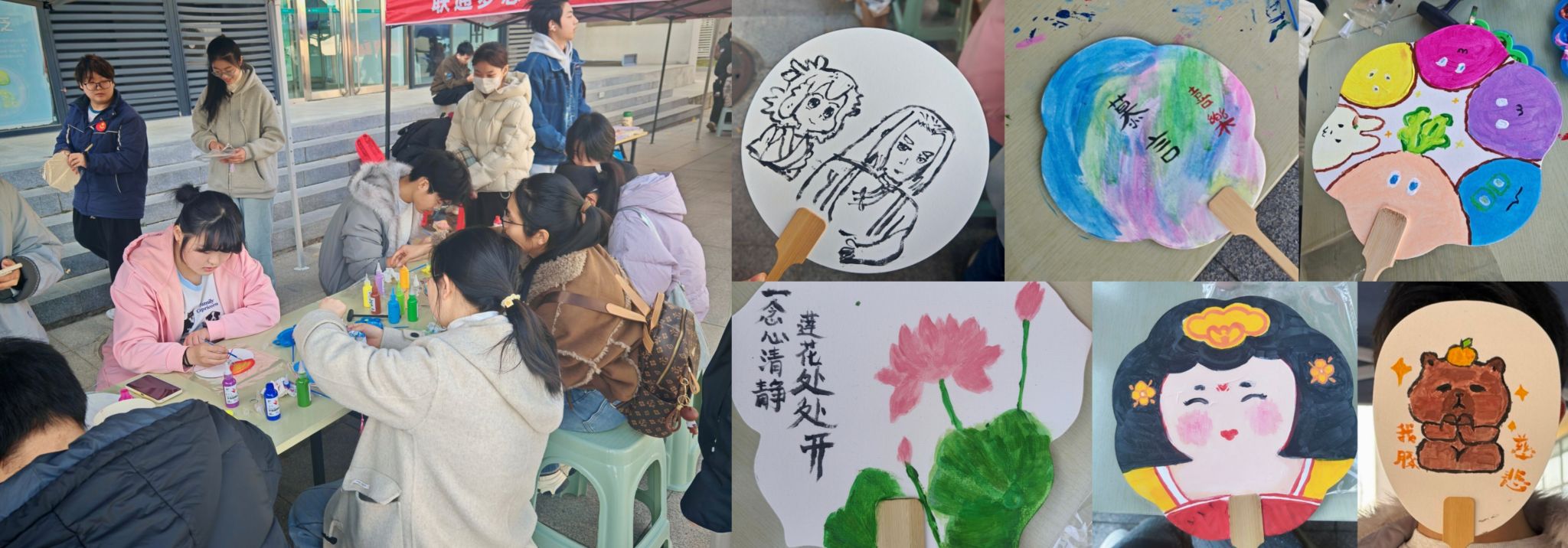11月26日下午,学院在“一站式”学生服务社区东侧广场开展“绘扇抒心”心理游园会活动。活动现场,同学们手持空白团扇,蘸取缤纷颜料自由创作,以画笔为媒介、以色彩为语言,将内心的情绪与感悟倾注于扇面之上。在沉浸式的创作过程中,大家不仅舒缓了身心压力、释放了创意灵感,更完成了一场与自我的温柔对话。
