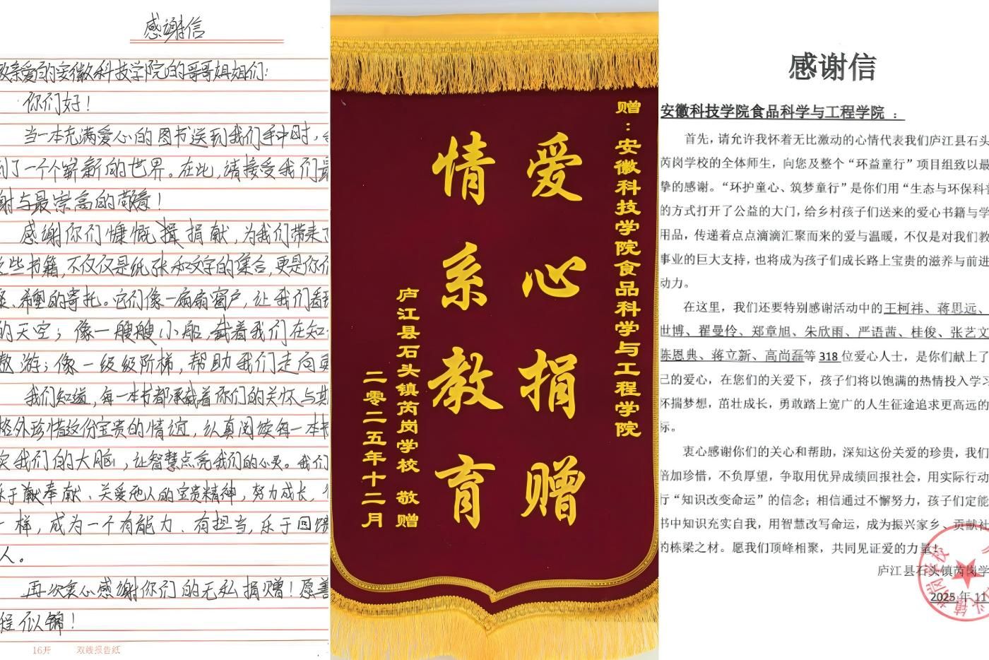 近日,食品科学与工程学院举办的“环益童行”公益主题活动圆满落幕,活动共筹集并捐赠371份爱心物资、100册爱心书籍以及271份爱心文具,全部送达庐江县石头镇芮岗学校。该校全体师生特意寄来感谢信,小朋友们也亲手书写了真挚的感谢卡片,并赠予一面饱含情谊的感谢锦旗,对学院师生的善举表达深深谢意。