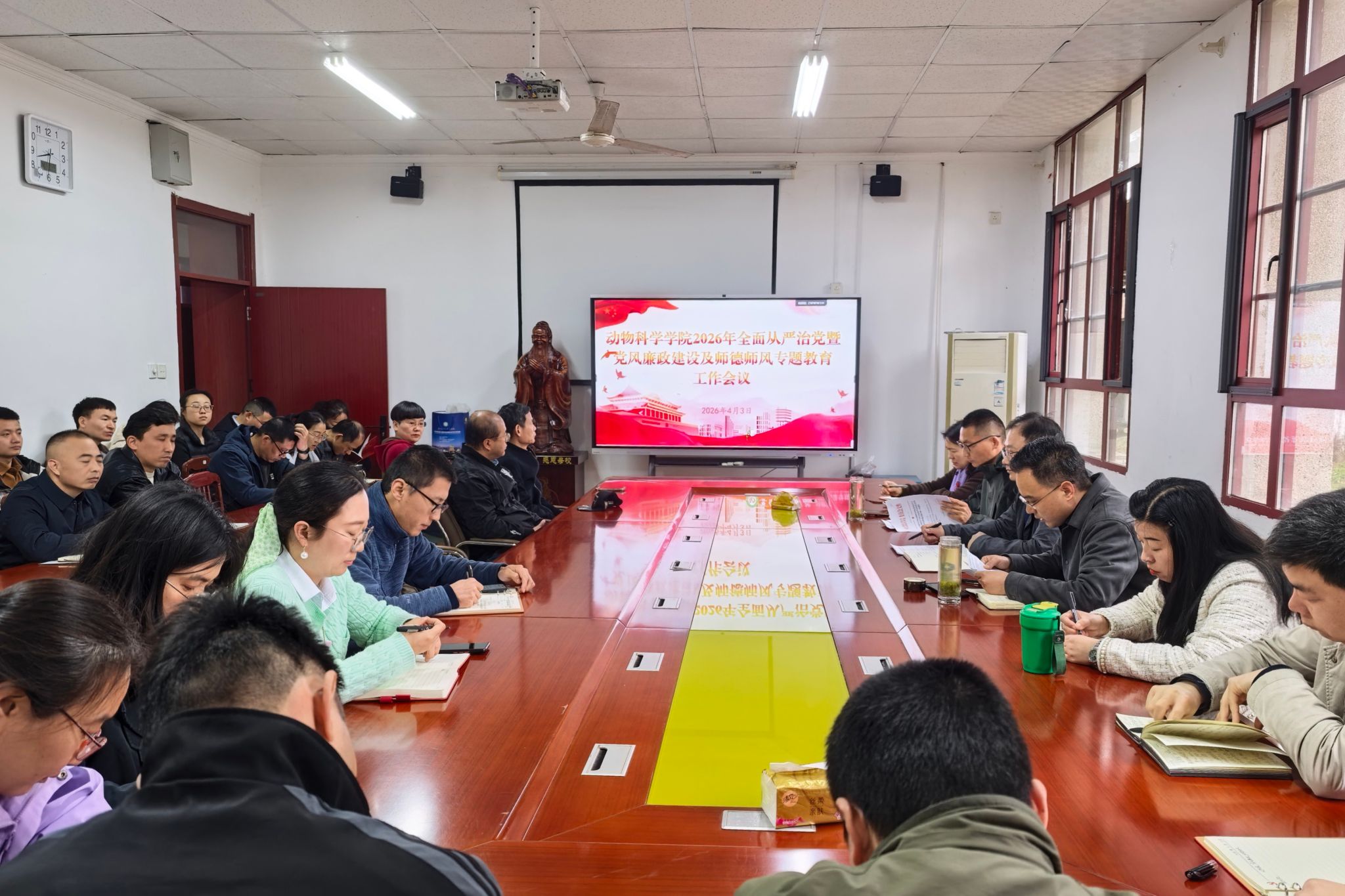 4月3日上午,动物科学学院在学院会议室召开2026年全面从严治党暨党风廉政建设及师德师风专题教育工作会议。学院党政领导及全体教职工参加会议,会议由学院党委书记甘宗平主持。