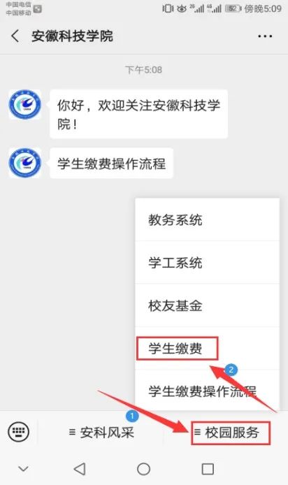1.点击“完美app官方在线入口微信公众号”界面右下角“学生缴费”菜单。