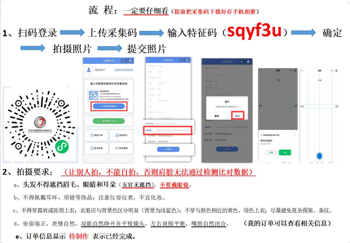 拍摄前须准备好本人的“图像采集码”。图像采集码获取办法: