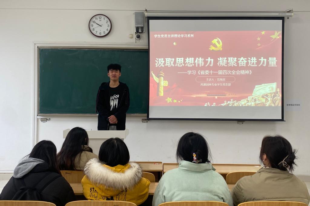 2023年3月9日“学生党员主讲理论学习”系列第一期顺利开讲。风景园林专业学生党支部学生党员范海滨以“汲取思想伟力 凝聚奋进力量”为主题带领支部全体成员认真学习了安徽省委十一届四次全会精神,准确把握了党中央决策部署及省委工作要求,号召全体党员更加紧密地团结在以习近平同志为核心的党中央周围,踔厉奋发、勇毅前行,忠诚尽职、奋勇争先,奋力谱写现代化美好安徽建设新篇章,为全面建设社会主义现代化国家、全面推进中华民族伟大复兴贡献安徽力量。随后,2名学生党员围绕学习内容分享了心得体会,其他成员进行了互动讨论。