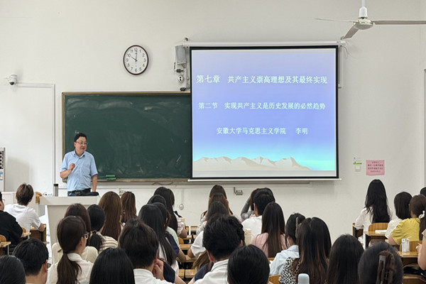 李明教授以“马克思主义基本原理”第七章“实现共产主义是历史发展的必然趋势”为主题进行教学授课。李明教授以人类社会发展规律为切入点,结合社会形态演进的历史脉络,深入浅出地论证了共产主义取代资本主义的历史必然性,将理论深度与现实观照相结合,系统阐释了共产主义社会的科学内涵与历史必然性。采用“理论讲解+案例分析+互动研讨”的教学方式,引导学生将“小我”融入“大我”,用奋斗擦亮青春底色。李明教授深厚的理论功底、严谨的治学态度与生动幽默语言,赢得了现场师生的阵阵掌声。
