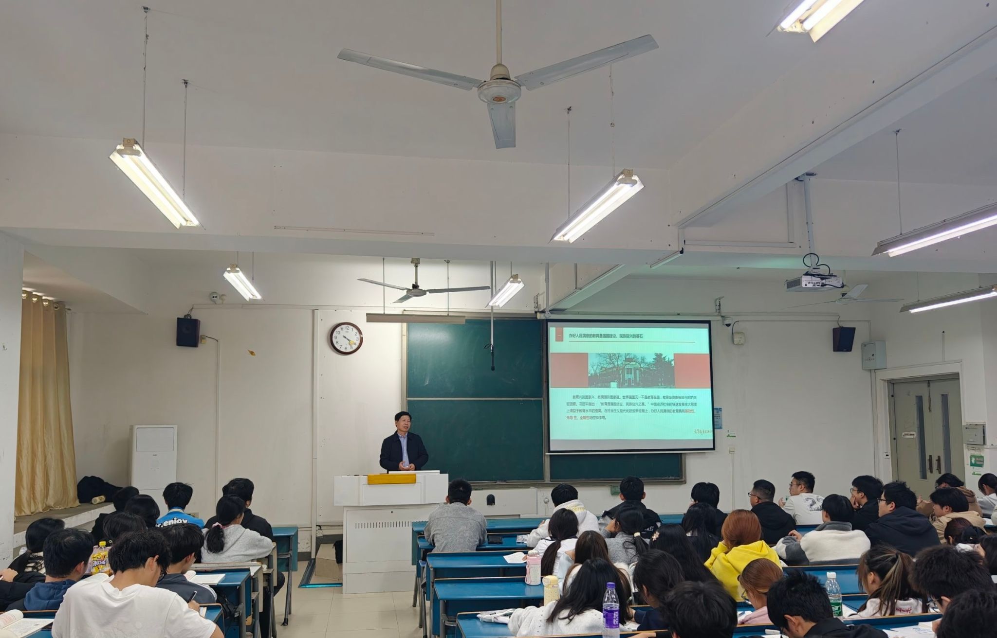 课堂上,时伟围绕“办好人民满意的教育”这一专题,结合党的二十大和党的二十届三中、四中全会精神,从历史逻辑、理论逻辑和实践逻辑三个方面,运用大量翔实数据,深入讲授教育是民族振兴和社会进步的基石,教育兴则国家兴、教育强则国家强,激发学生共同探索如何建设教育强国,引导青年学生立报国强国大志向、做挺膺担当奋斗者。