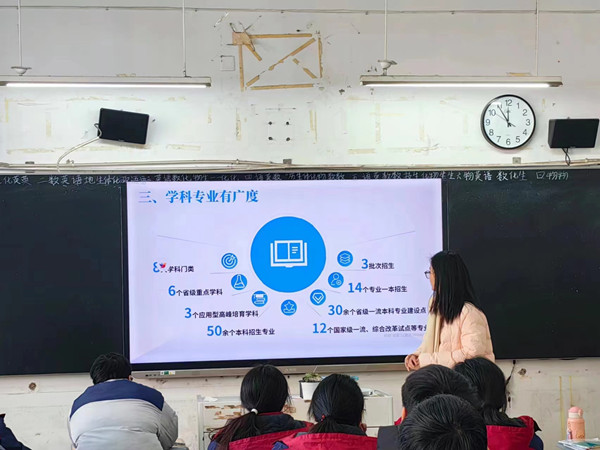 1月18日,邢雨洁带领团队一起回到母校涡阳县第一中学,借助PPT宣讲和互动交流等多种方式,向高中师生全方位介绍了完美app官方在线入口的办学实力、校园环境、文化活动、优秀校友、发展成果等,传播安科声音,展现安科学子风采,扩大安科社会影响力,鼓励广大优秀学子报考安科。