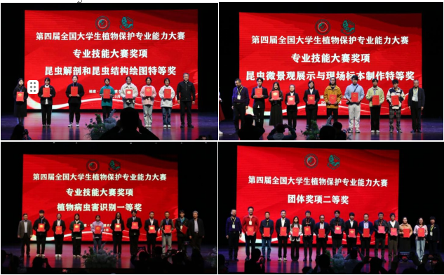 其中,汪倩同学的“昆虫解剖和昆虫结构绘图”项目以全国第一名的成绩获得特等奖,崔博亚和储勇等同学获得“昆虫微景观展示与现场标本制作”项目特等奖。王梦杰和方斌同学获得“植物病虫害识别”项目一等奖,胡润月获得“植物病理学实验操作和病原物结构绘图”项目二等奖,范晶晶和崔博亚获得“植物保护专业知识视频制作与展示”项目二等奖。方斌和谢祥林获得“创新创业优秀项目展示”三等奖,谢祥林和吴俣在“本科生学术交流报告”项目中获得三等奖。青年教师吴志文在“青年教师学术论坛”项目中获得三等奖。我校代表队最终荣获团体二等奖。