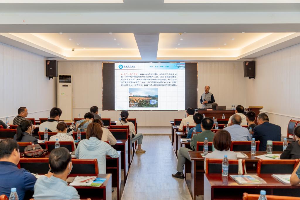 余海兵介绍了项目立项背景、项目实施与基地建设情况,介绍了我校选育的玉米新品种安科985、凤玉44品种特性与优势、及配套新技术。安科985具有抗病、抗高温高湿、稳产、高产等优良特性,满足我省灾害多发气候特征。凤玉44具有耐密植特性,符合玉米大豆条带复合种植模式的玉米品种需求。