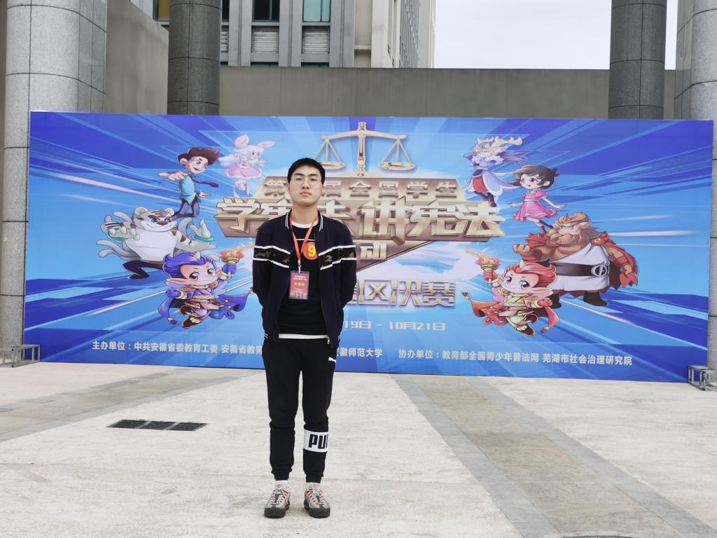 10月21日,由中共安徽省委教育工委、安徽省教育厅主办,安徽师范大学承办,教育部全国青少年普法网协办的安徽省第五届“学宪法 讲宪法”知识竞赛决赛在安徽师范大学拉开帷幕。人文学院法学专业2018级学生阮世龙代表学校参加比赛,获得二等奖的优异成绩。