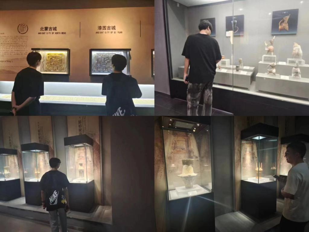 团队成员在查阅大量资料后,来到了蒙城博物馆进行参观学习。走进博物馆,映入眼帘的是一幅“四层楼”高的巨型锻铜浮雕。浮雕描绘了尉迟寺先民劳作、庄周梦蝶、灵山寺、以及楹联文化等图像,使团队成员们感受到了蒙城历史文化如此之深厚。接着,成员们来到了《蒙城的起源》展厅,展示的是出自“中国原始第一村”——尉迟寺遗址的青铜器、陶瓷制品、书籍以及一系列艺术品。成员们来到《古蒙神韵》展厅,展现了蒙城丰富多彩的历史文化,一代圣哲庄子、巾帼英雄刘金定、指画家苏延煜、女画家张襄,抗战时期的彭雪枫,周元皆在此地。参观过程中,团队成员纷纷感慨“蒙城真是人才辈出”?,并感叹于蒙城人民精于学习、善于创新、坚韧不拔的精神内涵。最后,成员们来到《楹联之乡》展厅,展厅两旁有两块匾,上面写有“吃百姓之饭,穿百姓之衣,莫道百姓可欺,自己也是百姓;得一官不荣,失一官不辱,勿说一官勿用,地方全靠一官”,短短几句话足以说明“为人民服务”的精神早已刻在了每个蒙城人的心中。