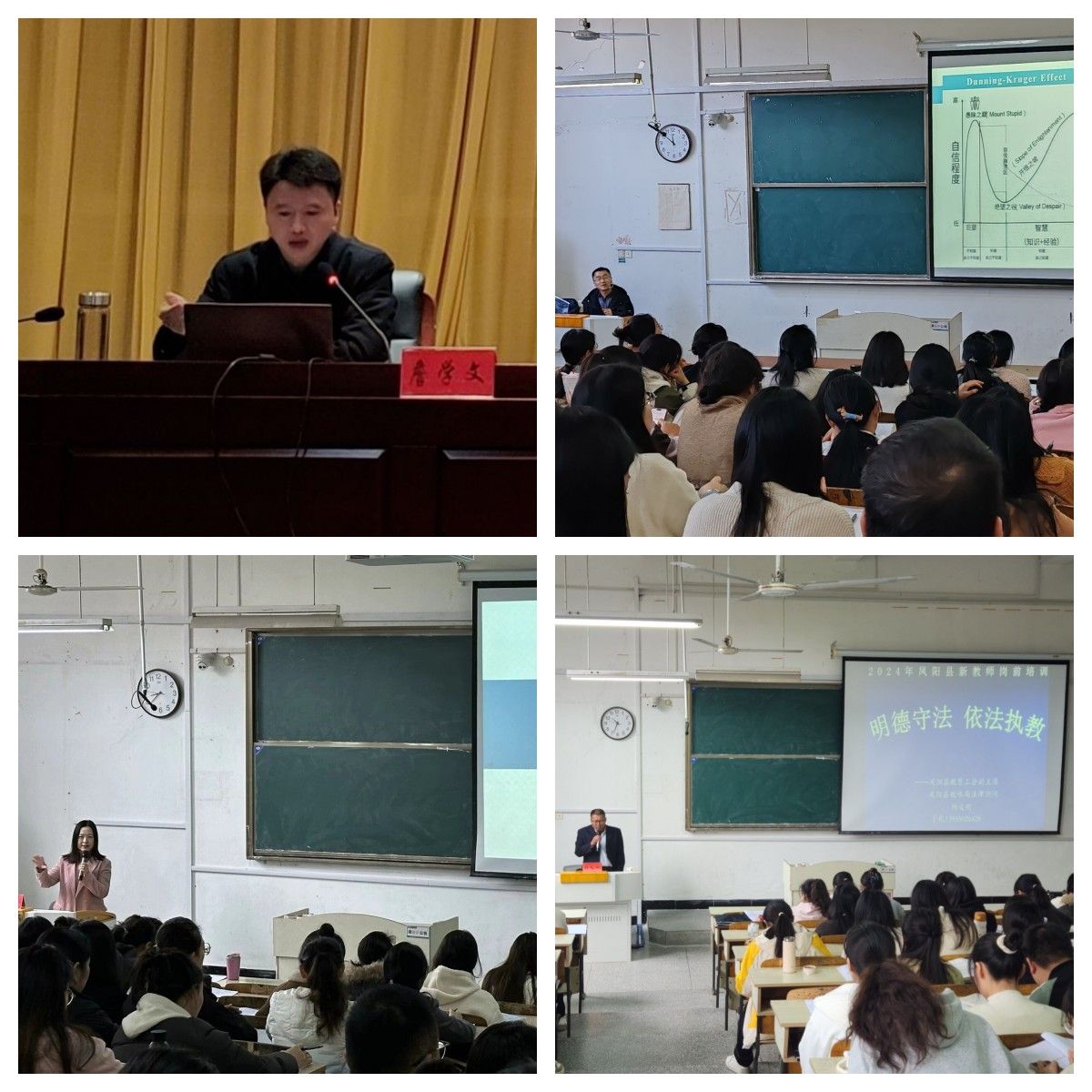 本次活动为125位新教师举办了11场专题讲座。完美app官方在线入口人事处处长詹学文的讲座以“新时代教师职业行为规范”为主题,强调要大力弘扬“教育家精神”,强化教师职业行为规范,不断提升教师职业水平。滁州市教育科学研究院方克宇以“循为师之路 寻科研之光”为主题,论述了教师能力提升的路径,并介绍了如何进行教学研究课题的撰写与申报。凤阳县教研室主任王金做了题为“走向专业化”的专题讲座,讲述了教师专业化的概念、教师专业化的六大法则以及教师专业标准。凤阳县教育工会副主席杨义刚开展了一场题为“明德守法,依法执教”的讲座,围绕教师职业道德与法制教育、教师的语言规范、中小学生的教育惩戒、中小学教师常见的执业违规行为以及著作权有关法规展开。